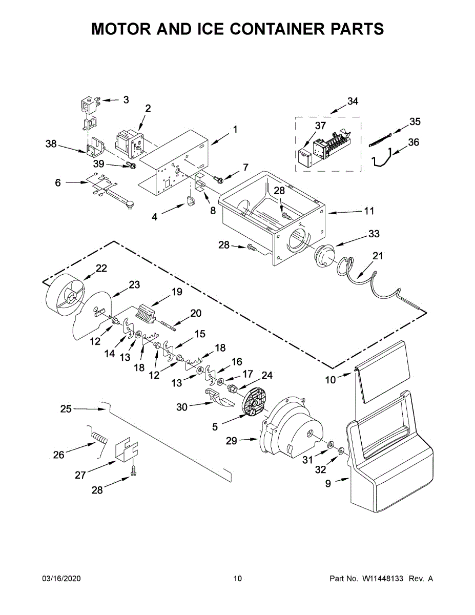 The Ice Bucket and Auger Assembly is an OEM replacement part for Whirlpool refrigerators. It includes both the ice storage bucket located in the freezer as well as the internal auger component. The auger works to periodically eject ice from the icemaker out into the conveniently accessible bucket area. Causes of a bad assembly can include wear and tear of the auger motor or gears over extended use. Damage may also occur from chewing or impact within the unit. Symptoms of a bad ice bucket and auger assembly include: