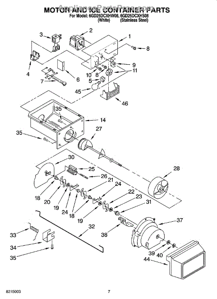Causes of a bad Ice Container Assembly can include cracks or damage to the bin, which can lead to ice leaks or accumulation in the freezer; wear or malfunction of the dispensing mechanism, affecting its ability to deliver ice.