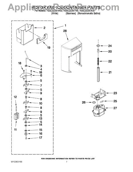 This ice container (ice bin) stores ice made by the icemaker and interfaces with the dispenser drive to deliver cubes or crushed ice. Replacing a cracked or worn bin restores dependable ice storage and dispensing performance.
