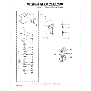 This ice container (ice bin) stores ice made by the icemaker and interfaces with the dispenser drive to deliver cubes or crushed ice. Replacing a cracked or worn bin restores dependable ice storage and dispensing performance.