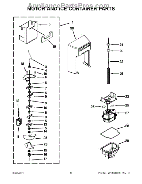 This ice container (ice bin) stores ice made by the icemaker and interfaces with the dispenser drive to deliver cubes or crushed ice. Replacing a cracked or worn bin restores dependable ice storage and dispensing performance.