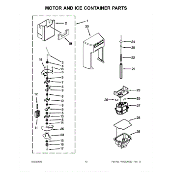 This ice container (ice bin) stores ice made by the icemaker and interfaces with the dispenser drive to deliver cubes or crushed ice. Replacing a cracked or worn bin restores dependable ice storage and dispensing performance.