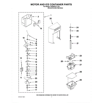 This ice container (ice bin) stores ice made by the icemaker and interfaces with the dispenser drive to deliver cubes or crushed ice. Replacing a cracked or worn bin restores dependable ice storage and dispensing performance.