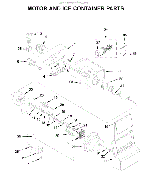 The Ice Bucket and Auger Assembly is an OEM replacement part for Whirlpool refrigerators. It includes both the ice storage bucket located in the freezer as well as the internal auger component. The auger works to periodically eject ice from the icemaker out into the conveniently accessible bucket area. Causes of a bad assembly can include wear and tear of the auger motor or gears over extended use. Damage may also occur from chewing or impact within the unit. Symptoms of a bad ice bucket and auger assembly include: