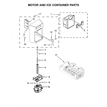 This ice container (ice bin) stores ice made by the icemaker and interfaces with the dispenser drive to deliver cubes or crushed ice. Replacing a cracked or worn bin restores dependable ice storage and dispensing performance.