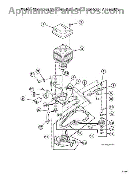 This kit replaces the washer's pump and its belt on Model M designs, restoring dependable water removal and belt-driven operation. Install it to address leaks, seized pumps, or a worn/broken belt causing drain or spin complaints.