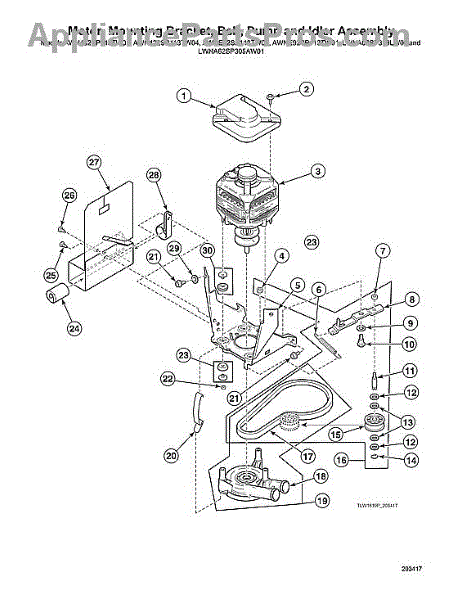 This kit replaces the washer's pump and its belt on Model M designs, restoring dependable water removal and belt-driven operation. Install it to address leaks, seized pumps, or a worn/broken belt causing drain or spin complaints.