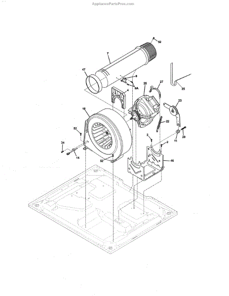 This dryer blower moves air through the drum, lint filter, and exhaust so laundry dries efficiently. Replacing a damaged blower restores proper airflow and helps prevent long dry times and overheating issues.