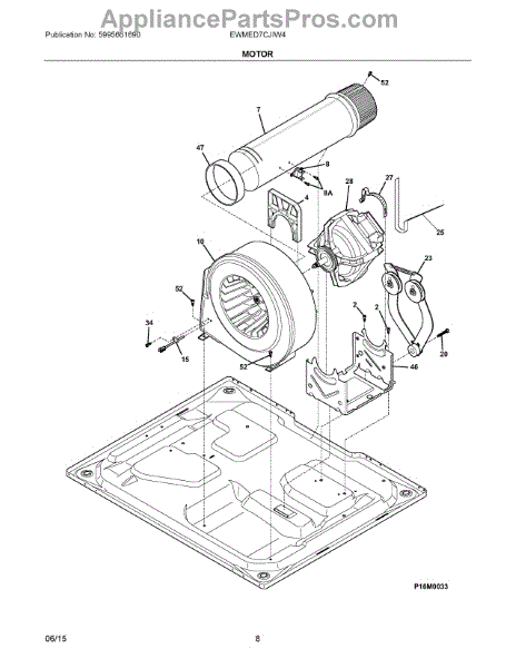 • Draws and circulates air across the heater, through the drum and lint filter, and out the vent