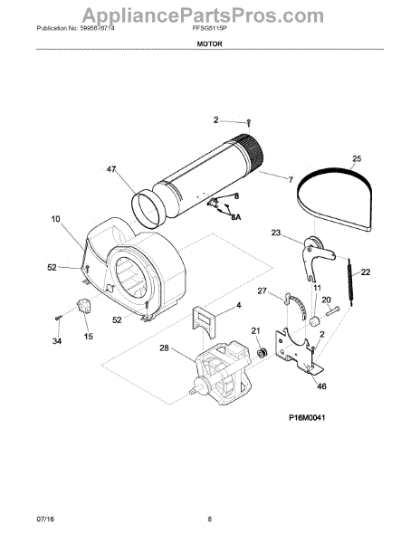 The Motor, Main w/ Pulley is an OEM replacement part for Frigidaire electric dryers. As the primary mechanical component, the motor works with the drum pulley to spin the dryer tumbler and circulate air during the drying cycle.