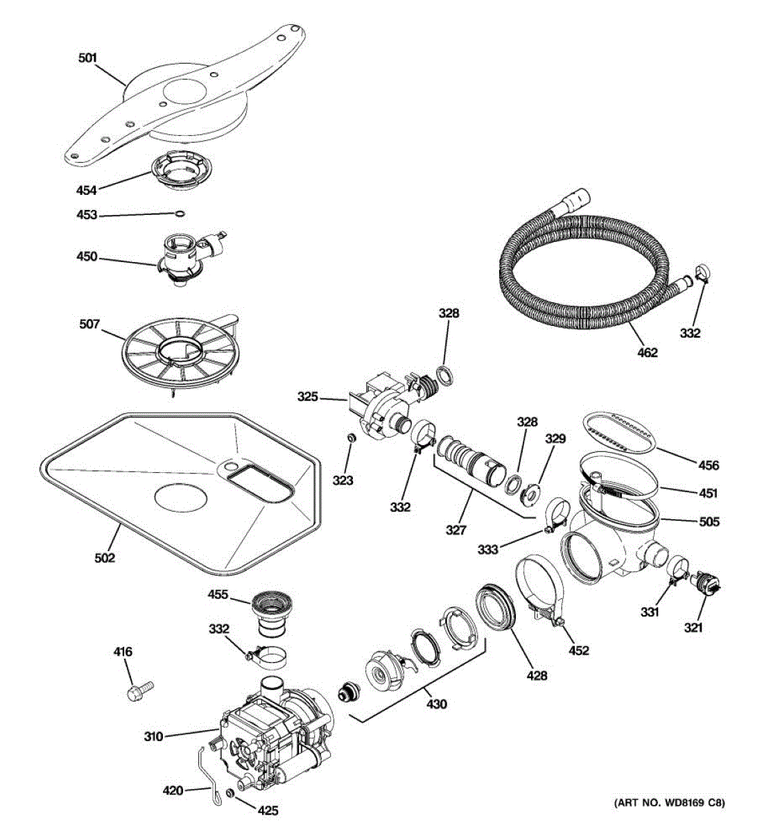 The Pump and Motor Assembly is an OEM replacement part for GE dishwashers. It works to circulate water throughout wash and rinse cycles. The motor spins the integrated pump impeller to draw fresh water into the dishwasher and drain used water. Causes of a bad pump and motor assembly can include mineral buildup on pump parts inhibiting water flow, worn motor windings reducing efficiency, or damage from freezing temperatures. Symptoms of a bad pump and motor assembly include: