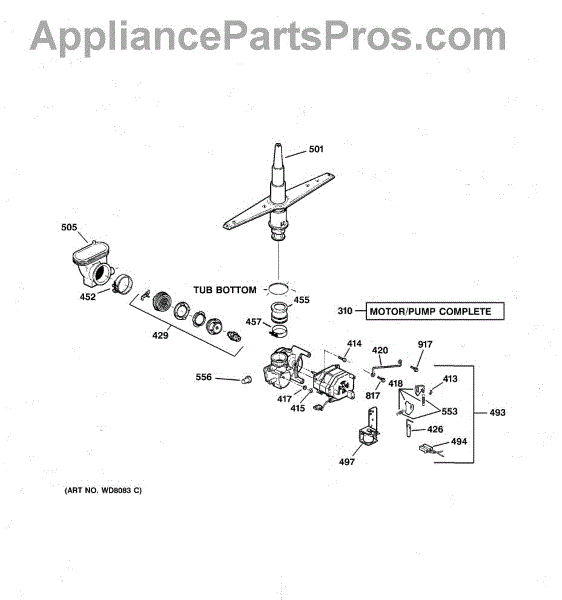 The Lower Spray Arm is an OEM component compatible with GE dishwashers.The spray arm is responsible for distributing water throughout the dishwasher and cleaning dishes. Causes involve mineral buildup obstructing water flow over time, or flexible arm components cracking under pressure. Symptoms of a faulty lower spray arm include: