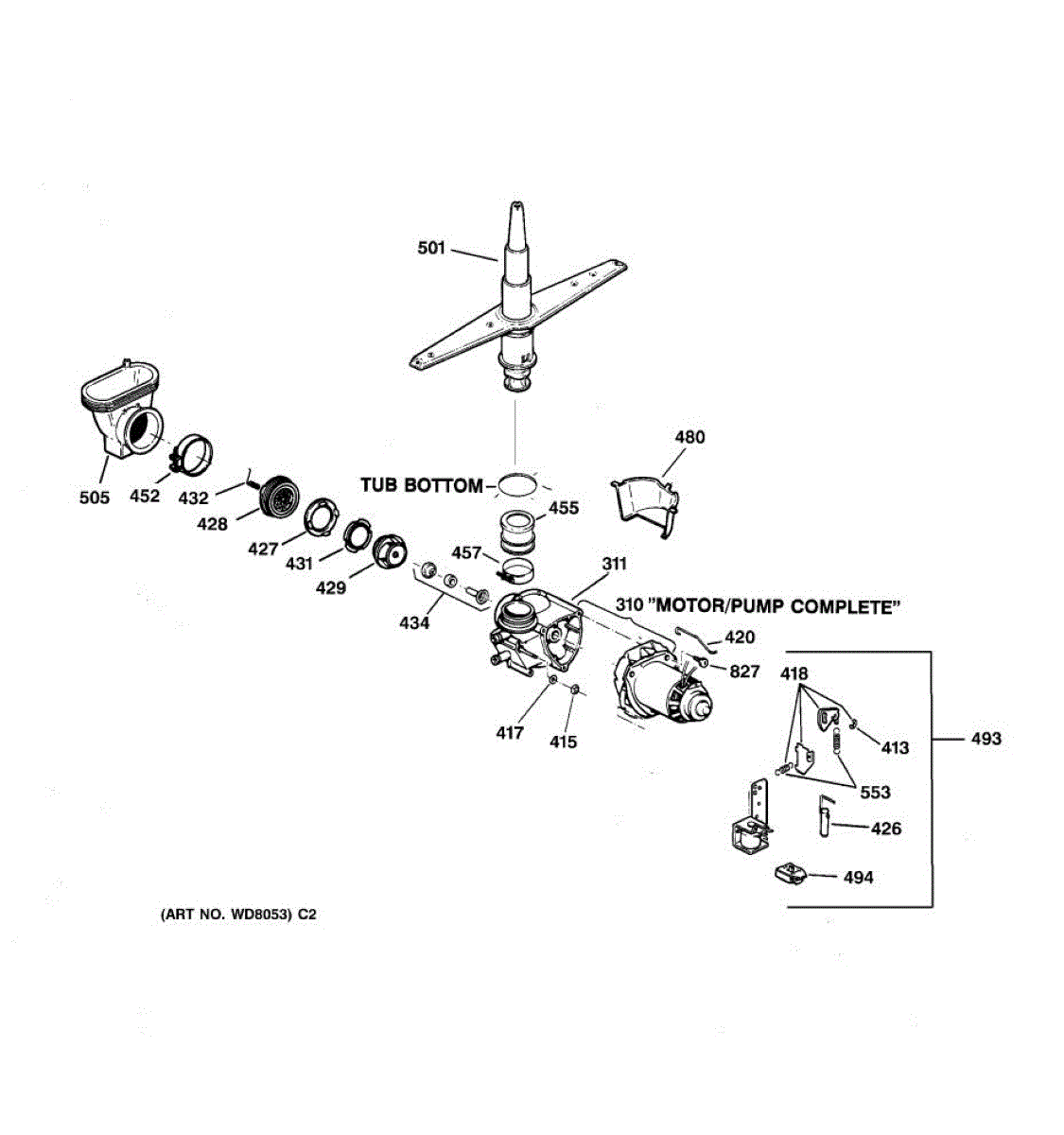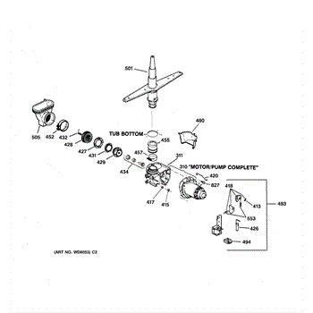The spray arm assembly distributes pressurized wash water through its jets and rotates to clean dishes. If it's cracked, clogged, or not turning freely, replacing it restores proper spray coverage and cleaning performance.