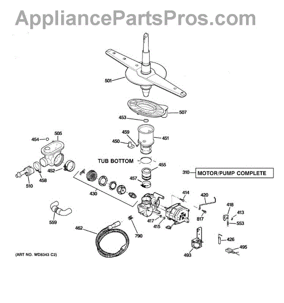The Lower Spray Arm is an OEM part for GE dishwashers, meticulously crafted to provide a direct replacement for the original component. This part is essential for ensuring that water is evenly distributed throughout the dishwasher during a cycle, reaching all dishes to effectively remove food debris and stains. The lower spray arm rotates and sprays water with precision, making it a critical element in achieving optimal cleaning performance. Causes for these issues often stem from regular use, such as the accumulation of hard water minerals leading to clogs, or physical damage from improper loading of dishes. Ensuring that the Lower Spray Arm is in good condition and free from obstructions is vital for maintaining the dishwasher's efficiency and cleaning effectiveness. Symptoms of a faulty Lower Spray Arm include: