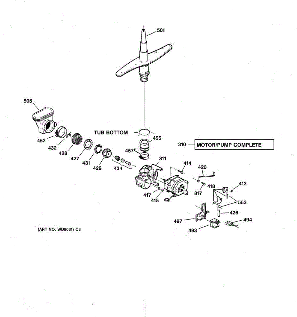 The spray arm assembly distributes pressurized wash water through its jets and rotates to clean dishes. If it's cracked, clogged, or not turning freely, replacing it restores proper spray coverage and cleaning performance.