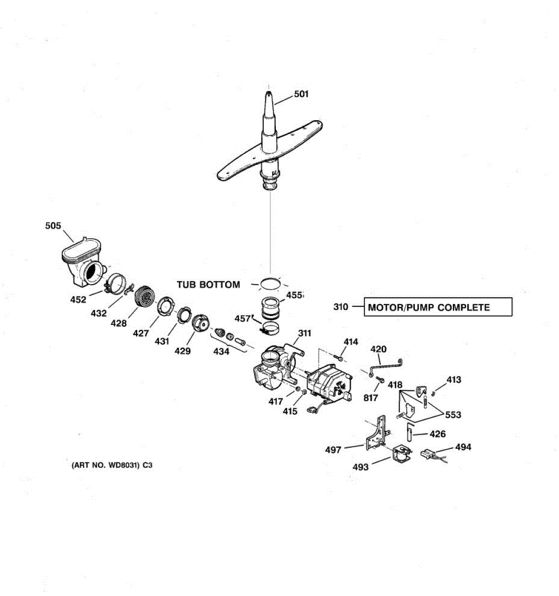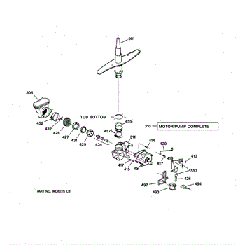 The spray arm assembly distributes pressurized wash water through its jets and rotates to clean dishes. If it's cracked, clogged, or not turning freely, replacing it restores proper spray coverage and cleaning performance.