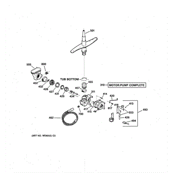 The spray arm assembly distributes pressurized wash water through its jets and rotates to clean dishes. If it's cracked, clogged, or not turning freely, replacing it restores proper spray coverage and cleaning performance.