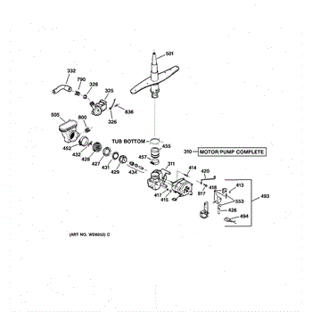 The spray arm assembly distributes pressurized wash water through its jets and rotates to clean dishes. If it's cracked, clogged, or not turning freely, replacing it restores proper spray coverage and cleaning performance.
