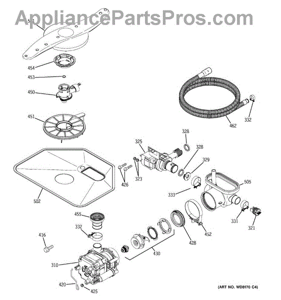 The Pump and Motor Assembly is an OEM replacement part for GE dishwashers. It works to circulate water throughout wash and rinse cycles. The motor spins the integrated pump impeller to draw fresh water into the dishwasher and drain used water. Causes of a bad pump and motor assembly can include mineral buildup on pump parts inhibiting water flow, worn motor windings reducing efficiency, or damage from freezing temperatures. Symptoms of a bad pump and motor assembly include: