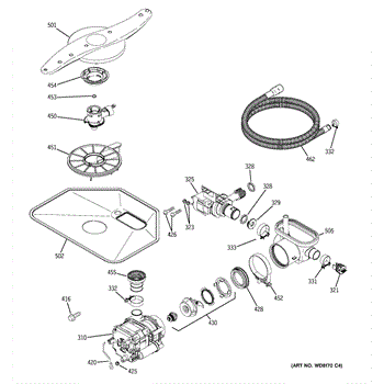 The Pump and Motor Assembly is an OEM replacement part for GE dishwashers. It works to circulate water throughout wash and rinse cycles. The motor spins the integrated pump impeller to draw fresh water into the dishwasher and drain used water. Causes of a bad pump and motor assembly can include mineral buildup on pump parts inhibiting water flow, worn motor windings reducing efficiency, or damage from freezing temperatures. Symptoms of a bad pump and motor assembly include: