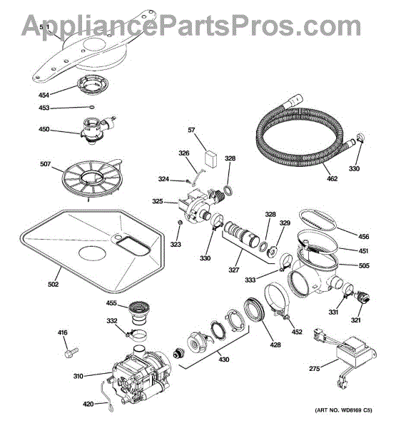 The Pump and Motor Assembly is an OEM replacement part for GE dishwashers. It works to circulate water throughout wash and rinse cycles. The motor spins the integrated pump impeller to draw fresh water into the dishwasher and drain used water. Causes of a bad pump and motor assembly can include mineral buildup on pump parts inhibiting water flow, worn motor windings reducing efficiency, or damage from freezing temperatures. Symptoms of a bad pump and motor assembly include: