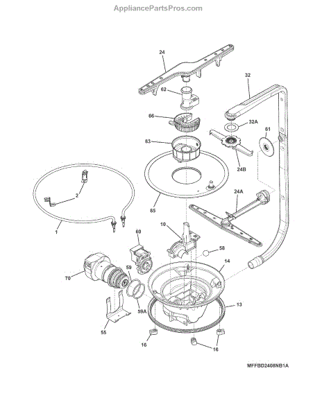 Covers and protects the dishwasher pump assembly. Replace if cracked, broken, or if plastic guides are stripped causing spray arm support issues.