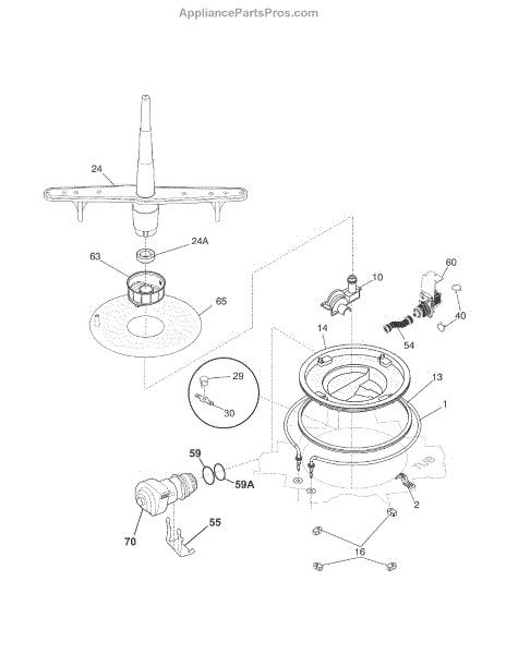 Replaces broken or cracked lower spray arm assembly with integrated heat shield. Snaps into place at bottom of dishwasher tub. Common damage includes broken tabs, melted plastic, or detached arm.