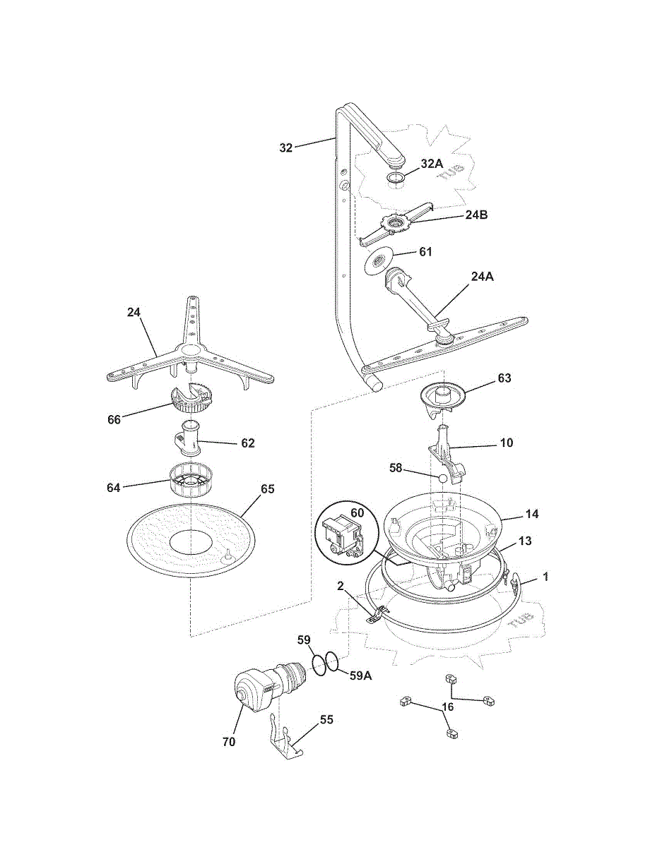 Covers and protects the dishwasher pump assembly. Replace if cracked, broken, or if plastic guides are stripped causing spray arm support issues.