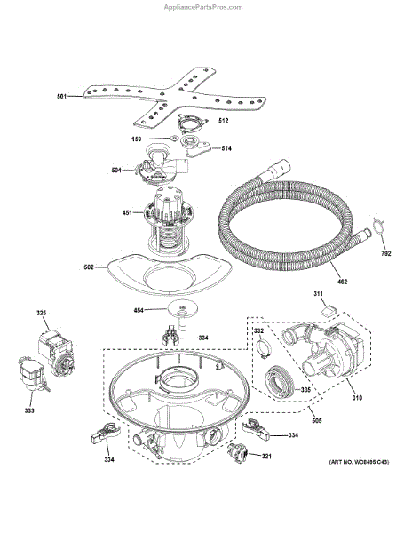 The Lower Arm Spray Assembly is an OEM replacement part for GE dishwashers. It refers to the horizontal component below the wash arm that provides lower zone spray coverage. Subject to years of continuous use, this plastic assembly can show wear.