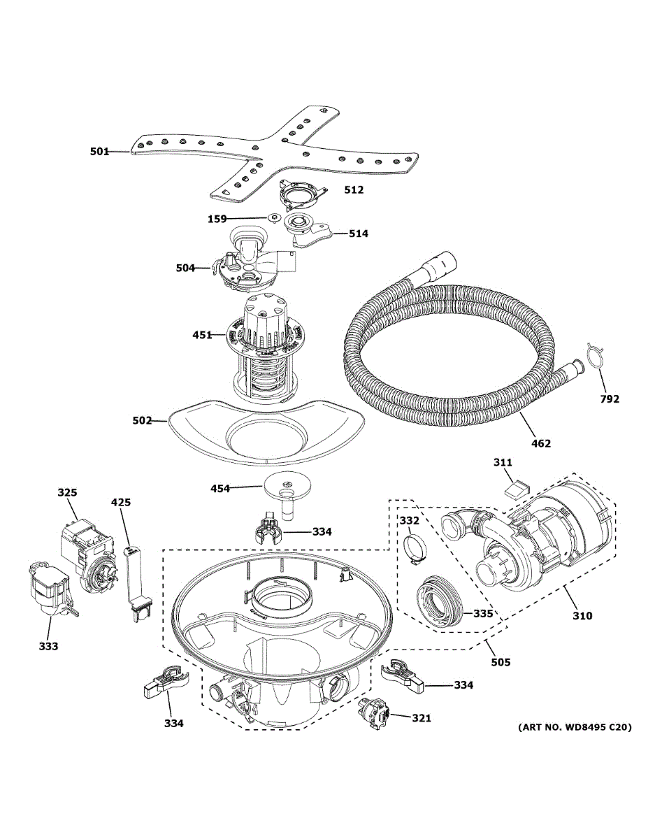 Lower spray arm assembly for dishwashers. Installs in the lower zone to distribute water during wash cycles. Replace if cracked, broken, or worn.
