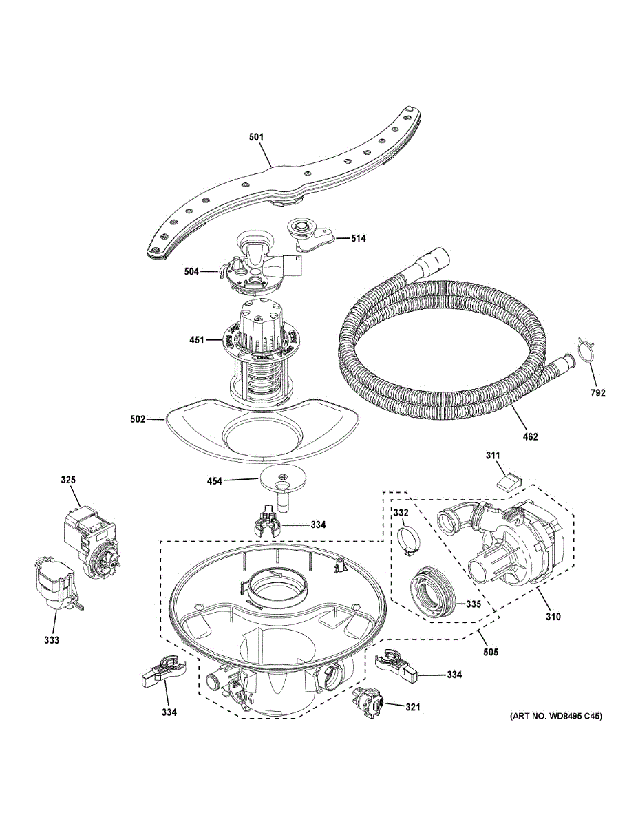 This wash pump kit is the dishwasher's circulation pump assembly that pressurizes and recirculates water through the spray arms. Replacing a failing pump restores wash pressure, cleaning performance, and helps eliminate leaks or loud humming/grinding from the sump area.