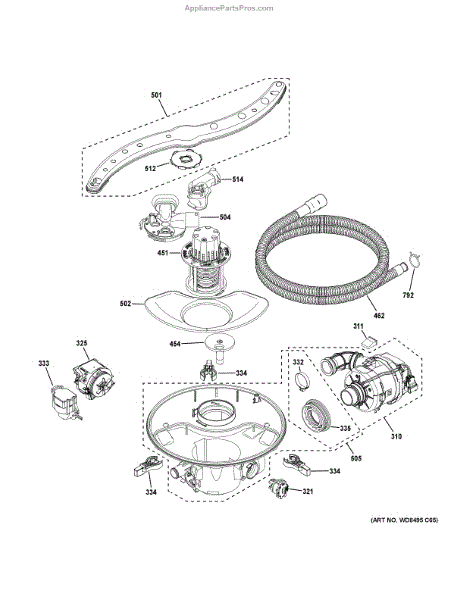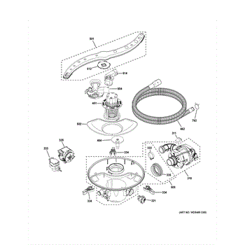 The Lower Spray Arm Assembly is an OEM replacement part compatible with GE dishwashers. This assembly consists of the tubular spray arm and attached brackets that secure it underneath the upper dish rack.