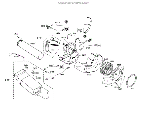 • Spins to draw and push air through the appliance's vent and heating chamber.