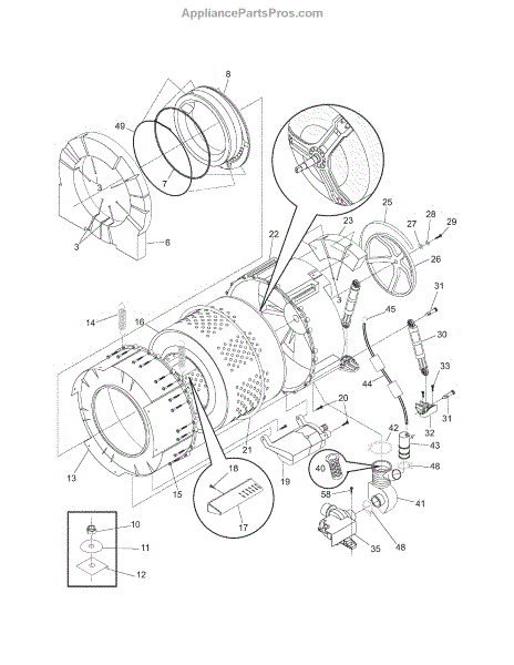 The Gasket is an OEM part for Frigidaire washing machines. This part is located between the front and rear outer tubs and prevents water leaks by maintaining a watertight seal between them. The gasket acts as a barrier to ensure that water used during the washing process remains contained within the inner tub, preventing it from seeping into the washing machine's surrounding components.