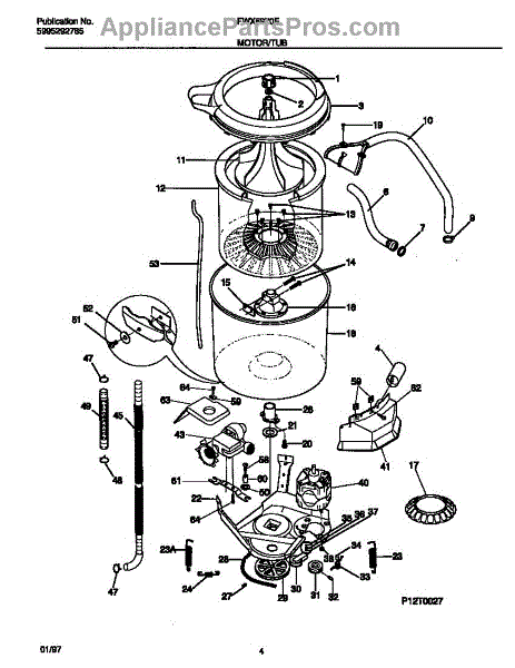Pressure tube connects washer tub to water level switch. Replace if cracked, kinked, or clogged to restore proper water level sensing in your laundry center.