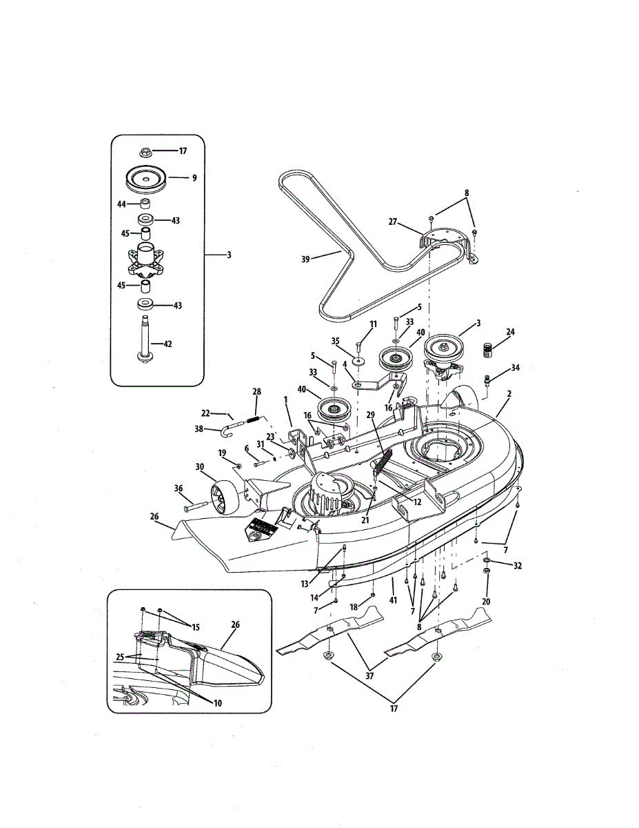 Idler mandrel pulley kit for lawn tractor mower decks. Includes pulley, spacer, and bushing. Replace if bearing is damaged, broken, or lost.