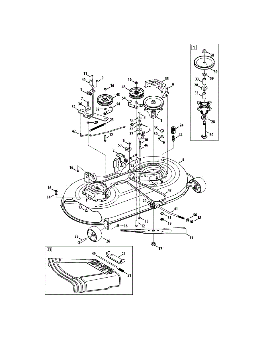 Spindle assembly for lawn tractor mower decks. Connects blade to drive belt for cutting operation. Replace if cracked, worn, or damaged bearings.