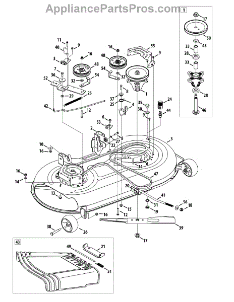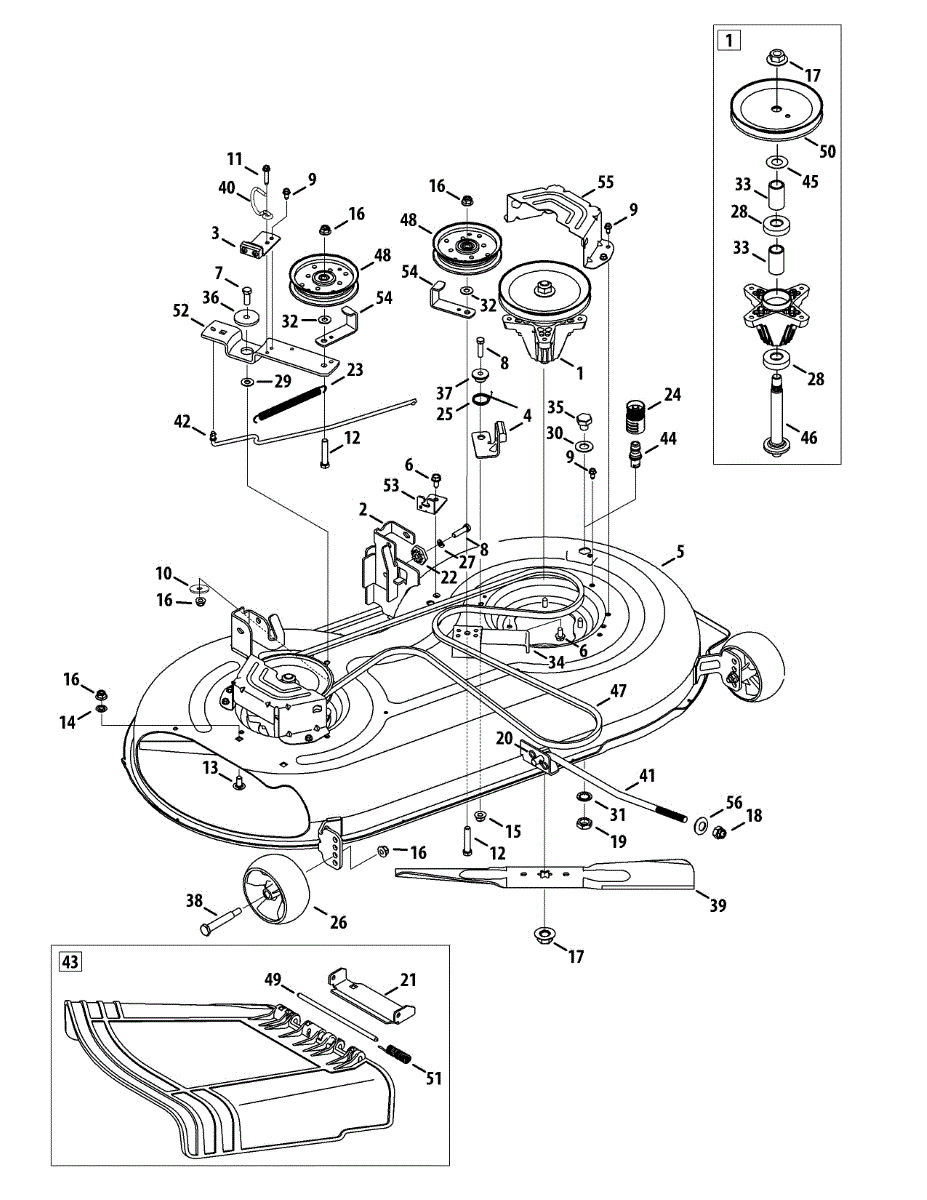 Spindle assembly for lawn tractor mower decks. Connects blade to drive belt for cutting operation. Replace if cracked, worn, or damaged bearings.