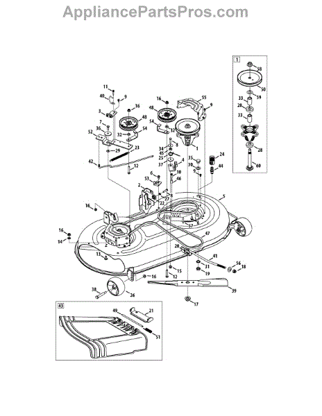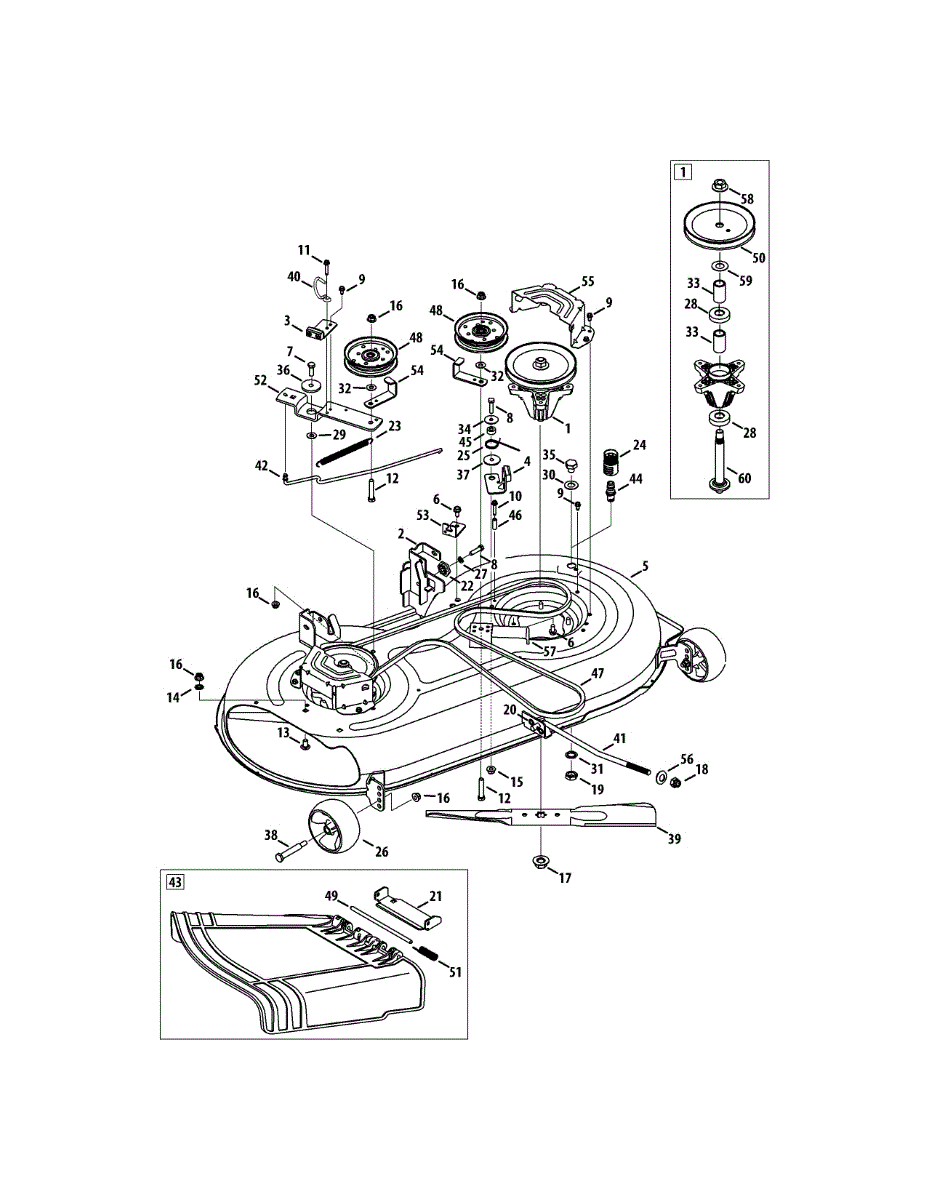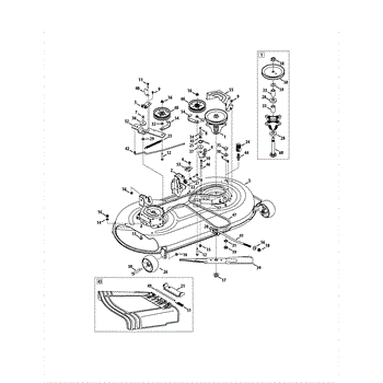 Spindle assembly for lawn tractor mower decks. Connects blade to drive belt for cutting operation. Replace if cracked, worn, or damaged bearings.