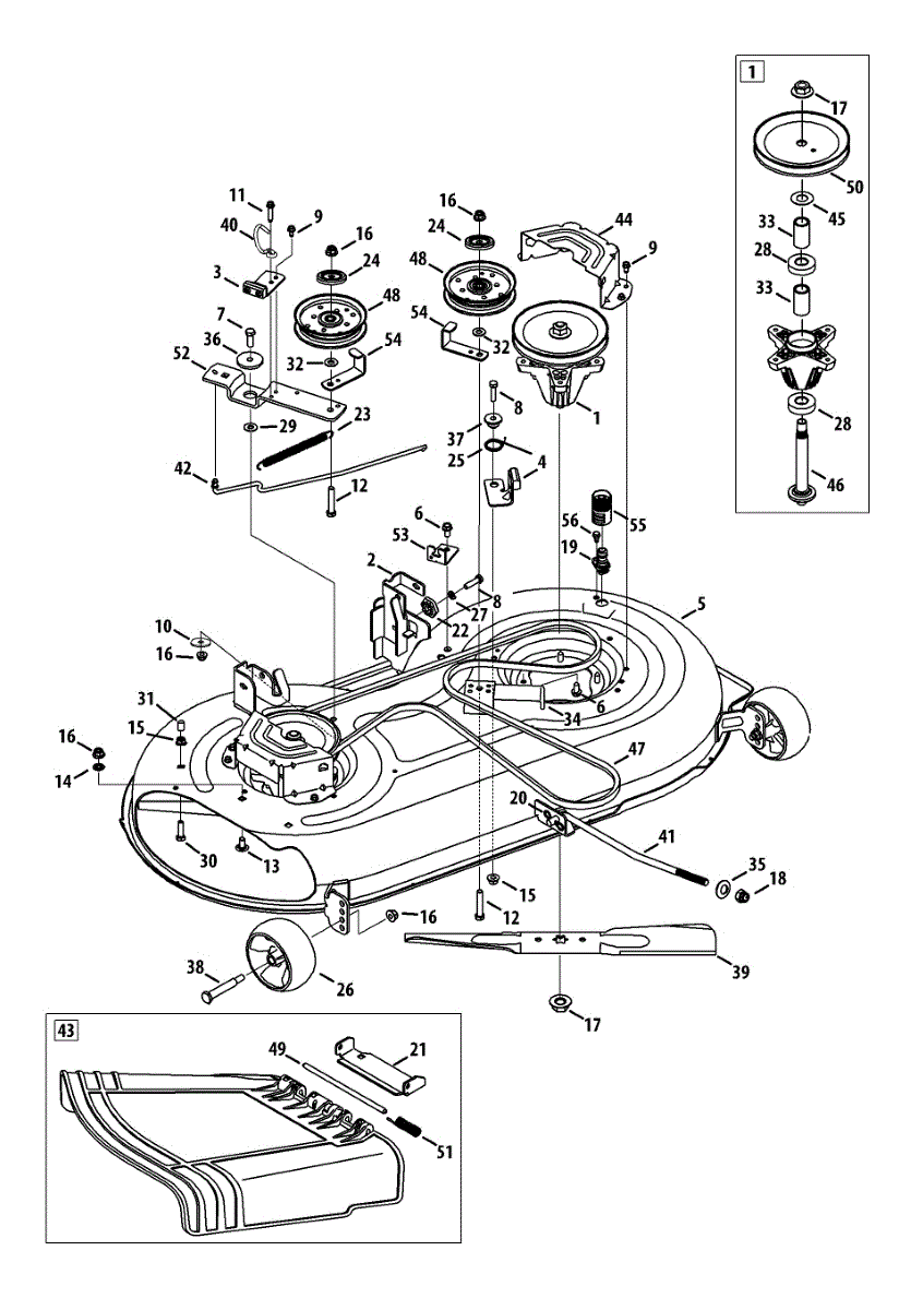 Spindle assembly for lawn tractor mower decks. Connects blade to drive belt for cutting operation. Replace if cracked, worn, or damaged bearings.