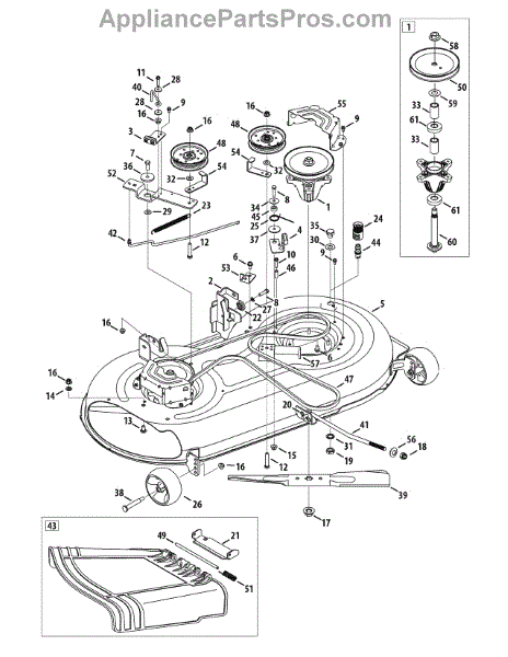 The deck assembly, also called a deck housing, is intended for use with lawn tractors. The purpose of the component is to provide housing for the blades on the lawn tractor. This helps to keep the blades and part of the underside of the tractor safe from damage that could occur when it is in use. It also ensures that the blades stay in place.This part could be damaged when running over rocks or branches. It could be cracked, blunted, or broken. If the piece does need to be replaced, allow the machine to cool and disconnect the spark plug wires before beginning any repairs.This large piece is sold individually and can work with select tractors from MTD, Yard Machines, and Craftsman. It is a genuine OEM replacement part.