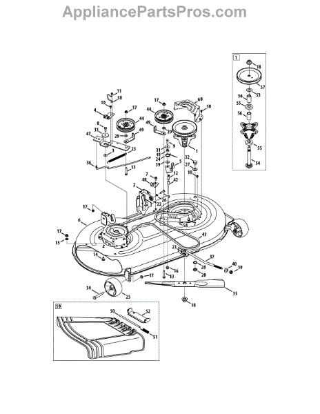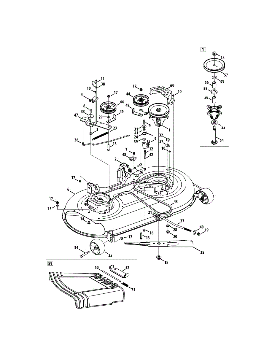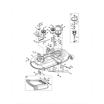 Spindle assembly for lawn tractor mower decks. Connects blade to drive belt for cutting operation. Replace if cracked, worn, or damaged bearings.