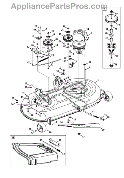 The deck assembly, also called a deck housing, is intended for use with lawn tractors. The purpose of the component is to provide housing for the blades on the lawn tractor. This helps to keep the blades and part of the underside of the tractor safe from damage that could occur when it is in use. It also ensures that the blades stay in place.This part could be damaged when running over rocks or branches. It could be cracked, blunted, or broken. If the piece does need to be replaced, allow the machine to cool and disconnect the spark plug wires before beginning any repairs.This large piece is sold individually and can work with select tractors from MTD, Yard Machines, and Craftsman. It is a genuine OEM replacement part.