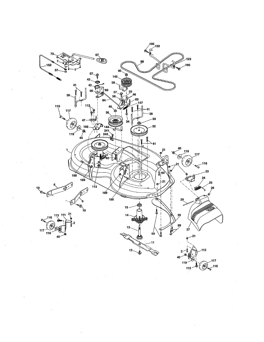 Deck spindle assembly that houses the blade mounting shaft on riding mowers. Bolts to the mower deck. Replace if housing is cracked, worn, or damaged.