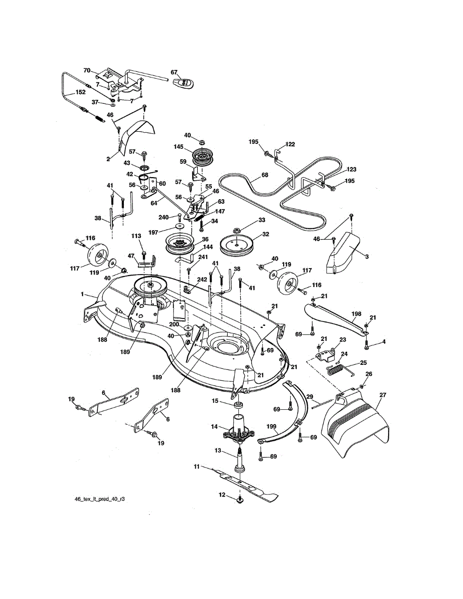 Deck spindle assembly that houses the blade mounting shaft on riding mowers. Bolts to the mower deck. Replace if housing is cracked, worn, or damaged.