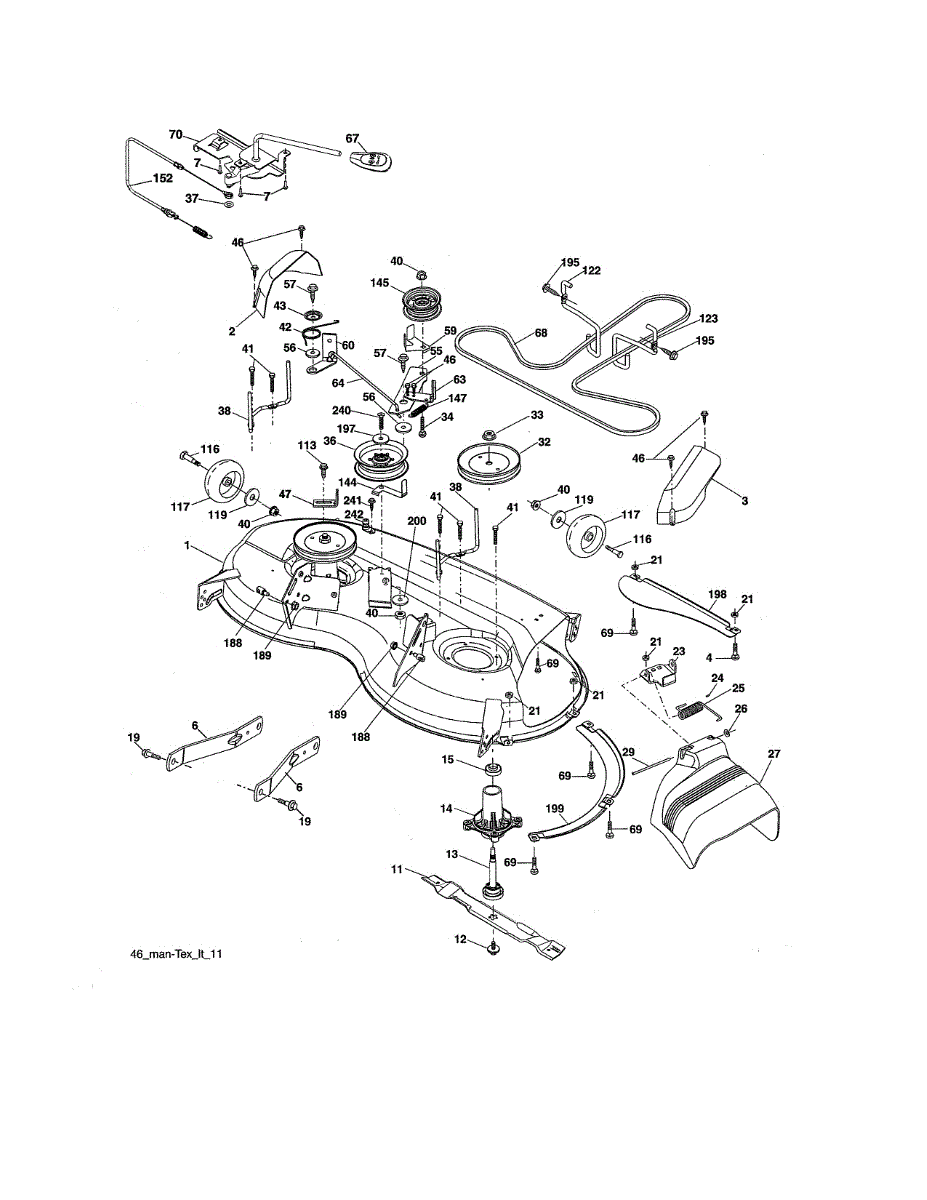 Mechanical clutch cable for riding mowers with lever-operated transmissions. Replace if cable is frayed, stretched, broken, or no longer engages smoothly.