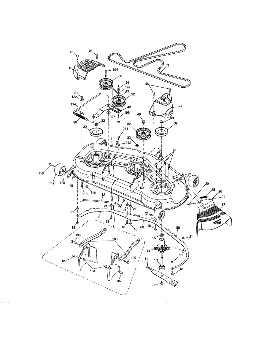 Discharge deflector for lawn tractors. Mounts to the mower deck to control grass clippings. Replace if cracked, broken, or missing for proper debris flow.