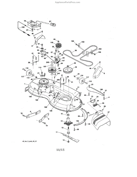 This no grease mandrel assembly is the part that houses the shaft where the mower blade attaches. It is mounted to the deck of the mower by three bolts, which are sold separately. The mounting holes on the mandrel housing are not threaded, but the bolts used to secure the mandrel to the deck are self-tapping. If the lawnmower is no longer providing an even cut, there may be a problem with the mandrel assembly. A broken or damaged mandrel assembly can severely reduce the mower's cutting performance. Replace it as soon as possible. The mandrel shaft goes through the deck, and the pulleys are attached to them, then the belt that drives the mandrels is placed in the pulleys. A spacer must be installed under the pulley. Failing to use a spacer or installing it on top of the pulley will result in damage to the shaft and pulley. This mandrel assembly is compatible with Ariens, Craftsman, Husqvarna, Poulan, and Weed Eater lawn mower models. It is an OEM part sourced directly from the manufacturer and is sold individually. The mandrel assembly includes a housing, shaft assembly, bearing, and nut only; the pulley/washer and blade bolt/washers are not included.