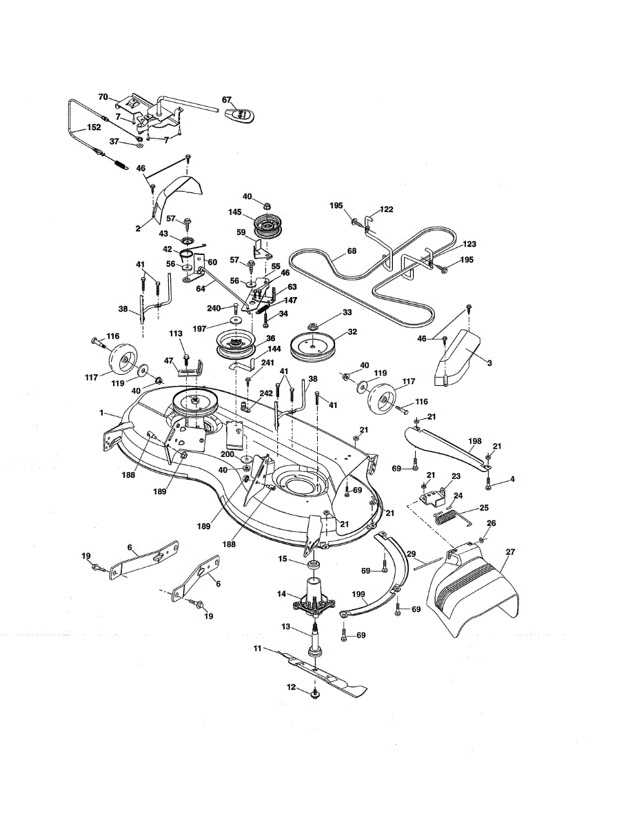 Deck spindle assembly that houses the blade mounting shaft on riding mowers. Bolts to the mower deck. Replace if housing is cracked, worn, or damaged.