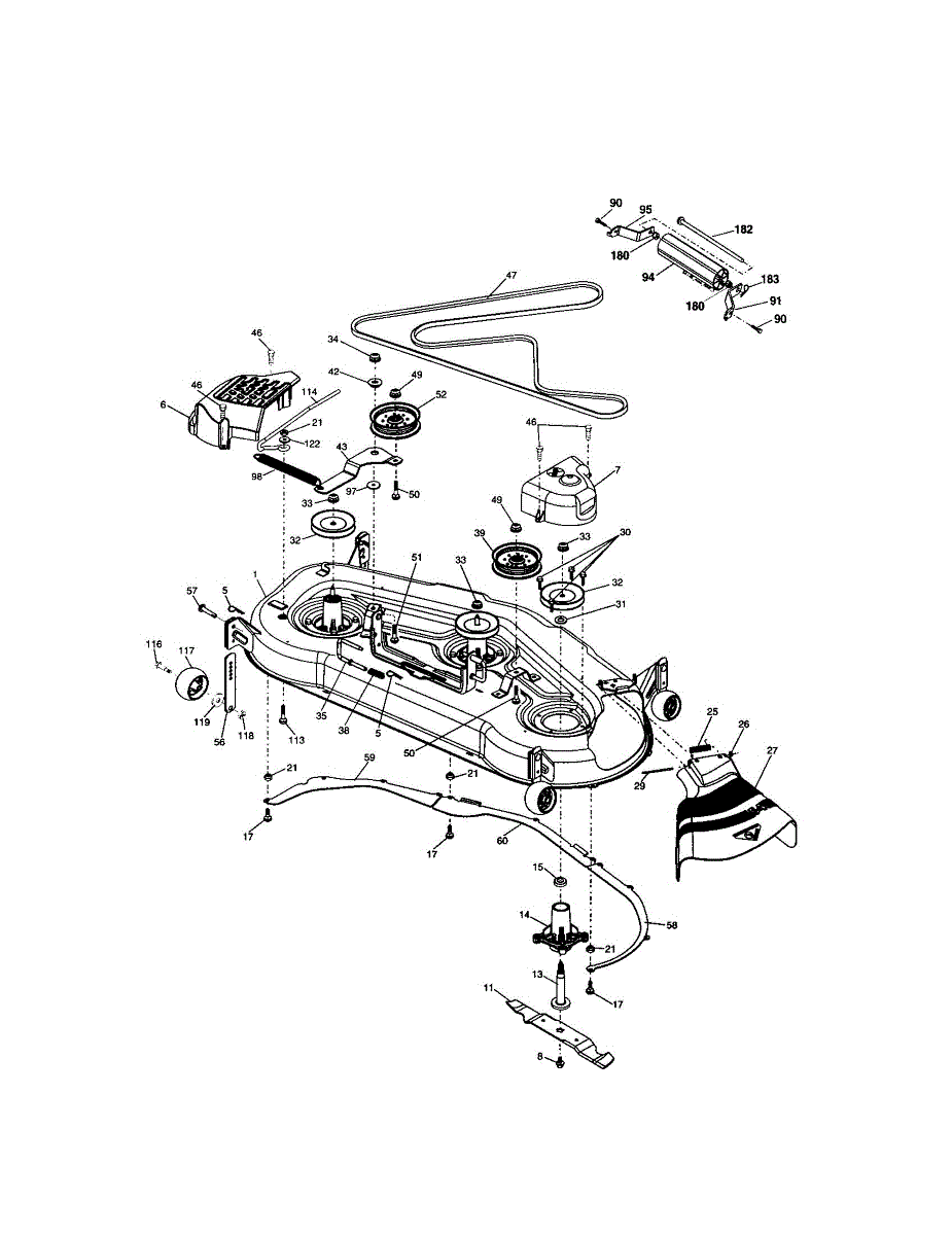 Discharge deflector for lawn tractors. Mounts to the mower deck to control grass clippings. Replace if cracked, broken, or missing for proper debris flow.